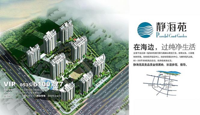 静海苑位于烟台开发区黄金海岸线滨海大道路南,黄河路路北,峨眉山路以东。大环境清新宜人,毗邻海滨路金沙滩公园,20公里黄金海岸线,南北有天然氧吧——防风林。北可“依云观海,黛翠临窗”,俯瞰天成海景,体验海景房的休闲与浪漫。