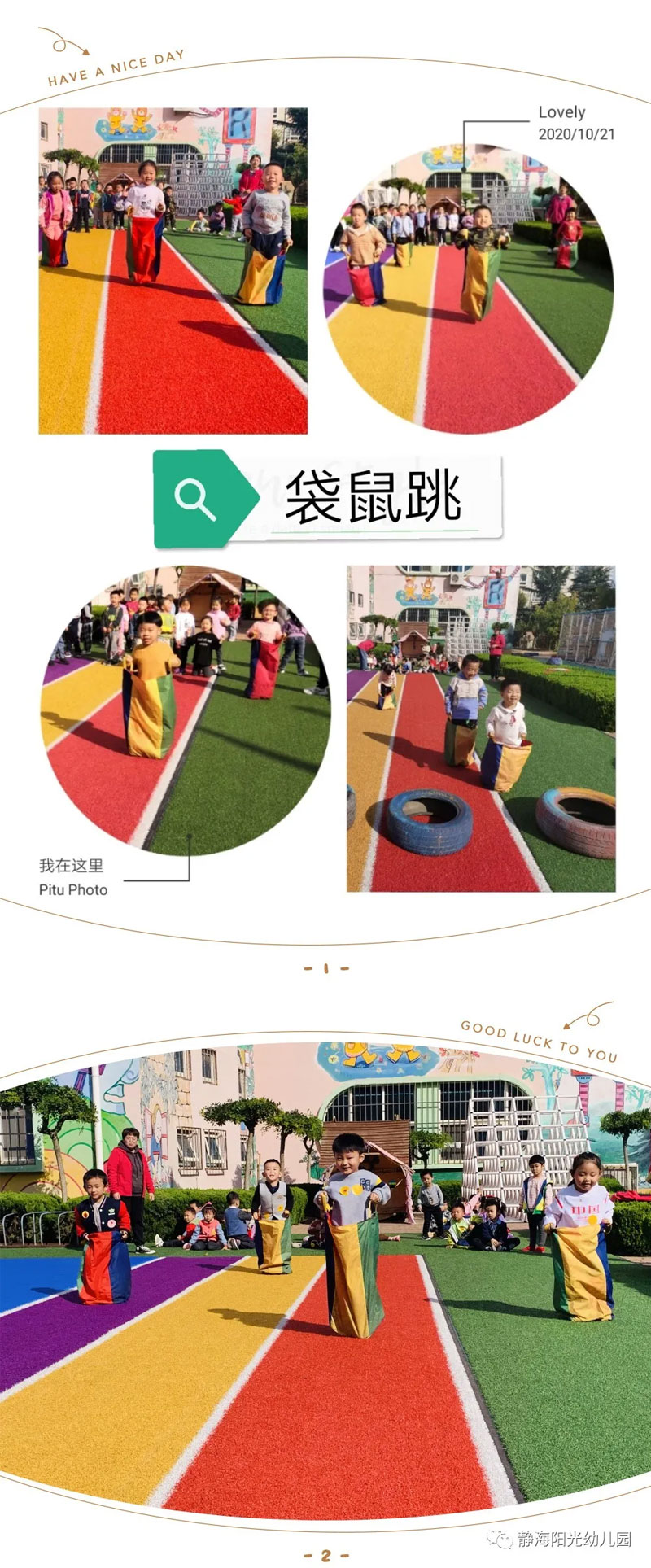 秋冬的暖日,映洒着我们的笑容;欢快的乐曲,激荡着我们的心灵。为激发幼儿积极参与活动的兴趣,锻炼意志力,培养合作意识,让幼儿在运动中体验成功和喜悦。静海阳光幼儿园于10月19-21日以级部为单位,举行了2020年秋季运动会。