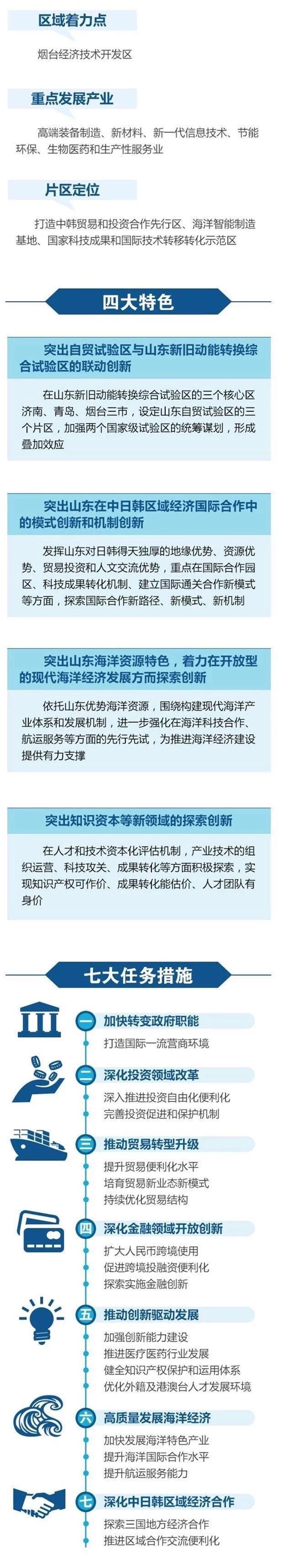 烟台自贸片区在加快转变政府职能、深化投资领域改革、推动贸易转型升级、深化金融领域开放创新、推动创新驱动发展和积极服务国家战略,六大任务框架下,着力在贸易便利化、优化贸易结构金融开放创新、跨境投资、人才培养等方面开展制度创新。以创新驱动海洋经济高质量发展,不断深入中日韩区域经济合作。